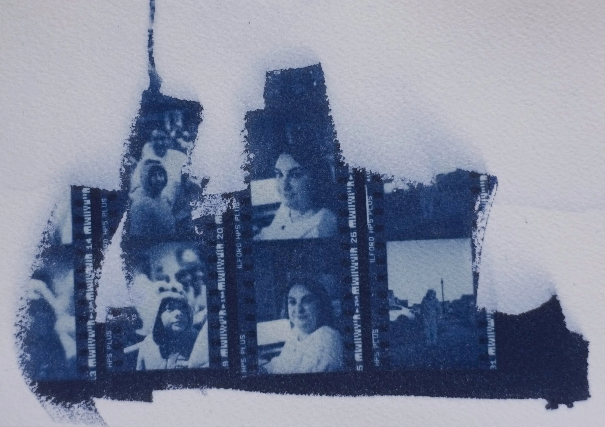 For take two I have a much better understanding of exposure times. The lights I am using are very weak and need a 15 to 35 minute exposure to get any tonal range. I also switched to using some shots that were taken with Illford hp5 400 pushed to 3200 these negatives are very thin which also made the exposure times shorter closer to 20 minutes. The first image is contact print from that film in negative sleeves and it was a huge success the resolution is extremely impressive considering how small a 35mm negative is. Illford hp5 has a bar code like control strip along the sprocket holes and you can see how accurate the and tight the print is. The second image is a more creative print. seeing the live edge of the first test and seeing the resolution I was able to get made me think about painting the sensitized solution on in a more abstract way to add a interesting live edge for the rest of the negatives on the sleeve to trail off into. Seeing this print come to life in the development bath caused me to become awestruck everything lined up so perfectly. This print just went from a test to something that I want to frame even though its a very small print. Ive done many contact prints from several other sheets and now Ive got the itch to print something larger.