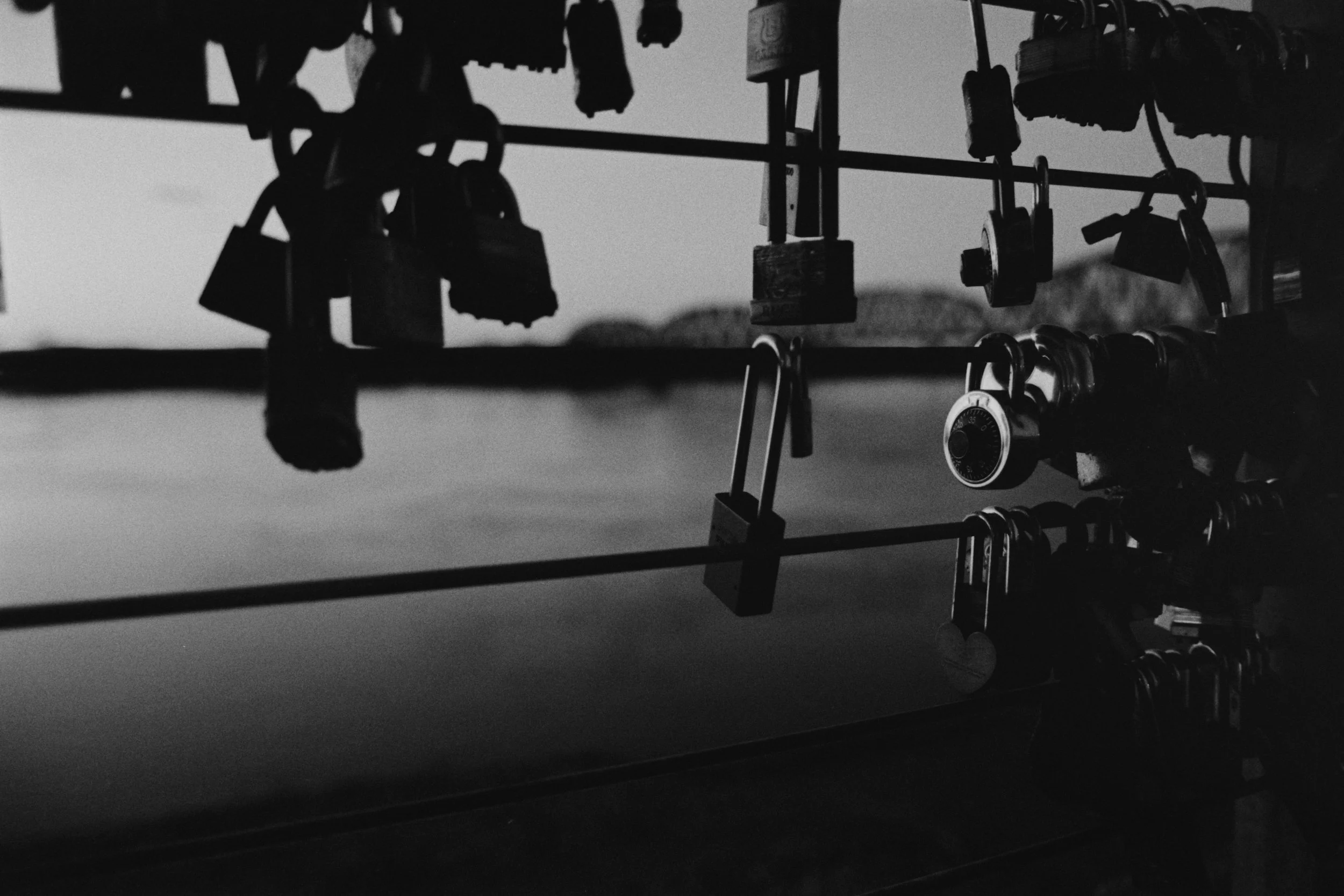 Locks hanging from a had rail at the Henderson Ky river front N90S 28-70mm f2.8 TRI-X 400